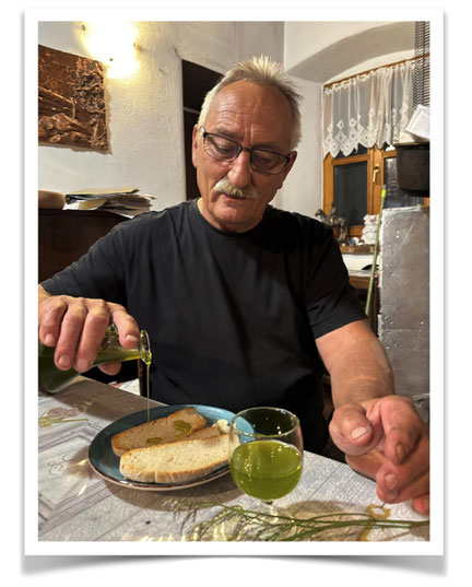 "Jedes Jahr freu ich mich drauf. Wenn du die Flasche zum ersten mal aufmachst, kommt dir gleich dieser frische Duft entgegen: nach Gras, grüner Mandel und a bisserl wilden Kräutern. Fast so, als wärst direkt bei mir im Olivenhain in der Toskana, wenn die Sonne grad aufgeht.